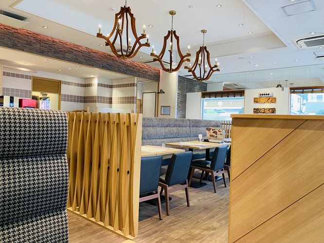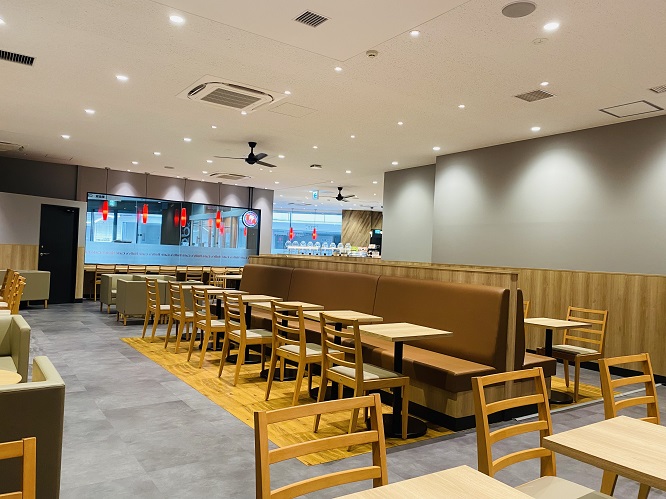 リニューアルされたばかりの店内は清潔感があり、木目調のテーブルや明るい照明が印象的です。