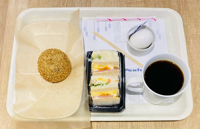 この日はモーニングセット「ハムたまご&ポテトサラダサンド」と単品の「白ごま団子」をチョイス。