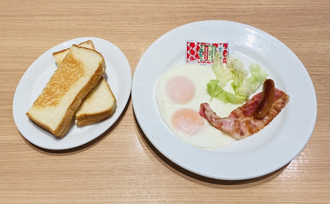 メインは、目玉焼きにベーコン、ソーセージ、ミニサラダという定番の組み合わせ。