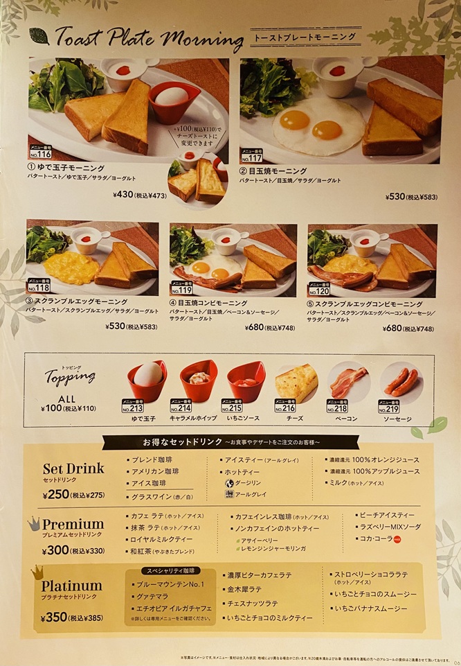 ↑モーニングサービスのメニューです。単品ドリンクの注文で4種類のトーストから1品がサービスとなります。そしてトーストプレートモーニング。